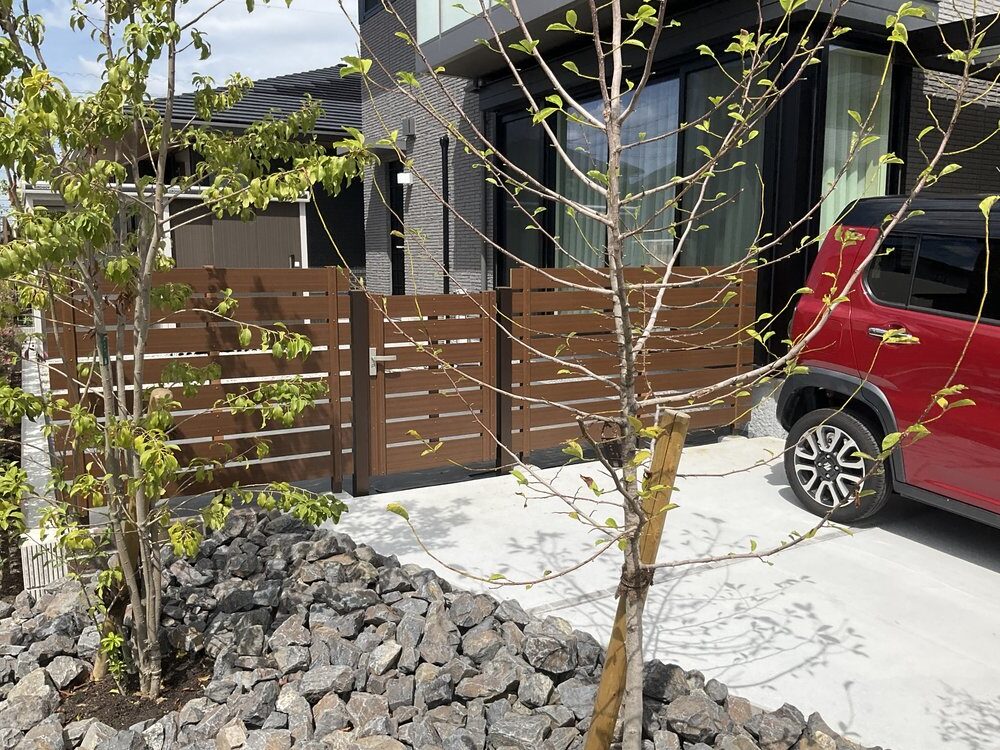 割栗石を敷き詰めた植栽越しに見える木目調のフェンスは、再生材から生まれた環境に優しい人工木で耐久性に優れていると言われています。